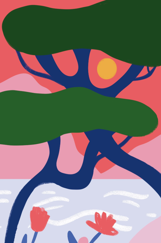 In the illustration you can see, I worked on a request to create an "Almanac Exquis": continuing a monthly creative chain in which each artist takes up and develops the previous work within the same format. Thirty Dirty Fingers wanted a contribution inspired by the sea, capable of dialoguing with the previous passages but with a personal touch. I created a Mediterranean coastal landscape with pine trees, using a limited palette of blue, red, pink and light blue from the previous illustration but adding green. In the illustration. In the video, uploaded to social media and below, you can see the common thread of the image that continues. This is a non-commercial project, designed to explore graphic experimentation and connections between creatives. View the complete series on Thirty Dirty Fingers.